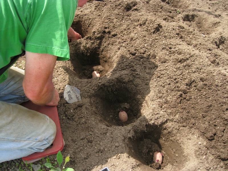 - Gīliča metode: dārza zemes gabalu sadala vienādos kvadrātos, katrs viena metra garumā. Katrā kvadrātā bagātīgi ieber kompostu un iestādi vienu lielu kartupeļu bumbuli. Tiklīdz parādās pirmie asni, auga centrā ielej augsni (lai dzinumi augtu leņķī). Atkārtojiet procesu, līdz izveidojas vairāki līmeņi. Ar pietiekamu laistīšanu viens šāds augs var dot aptuveni 15 kg sakņaugu.