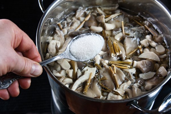 - Vāriet puskilogramu austeru sēņu 5 minūtes, pievienojot ēdamkaroti sāls.