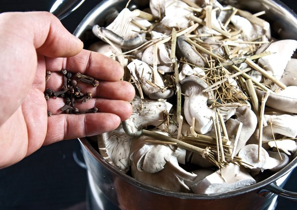 - Ievietojiet sēnes katliņā, pievienojiet piparus, dilles un krustnagliņas.