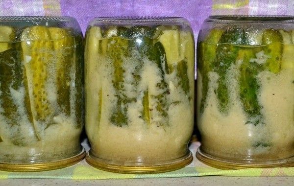 Atlasītos, iepriekš nomazgātos un izmērcētos gurķus ievieto litru burkās, pievienojot dilles, mārrutku lapas un ķiplokus. Pagatavojiet sālījumu: 1 litrā ūdens izšķīdiniet 1 ēdamkaroti sāls un 2 ēdamkarotes granulētā cukura, uzvāriet un ielejiet sālījumu burkās.