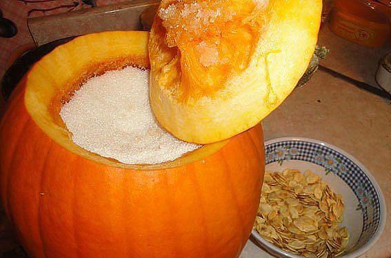 Tev būs nepieciešams vidēja lieluma ķirbis. Tam jābūt gatavam. Nomazgā un rūpīgi nosusini to. Nogriez augšpusi, lai izveidotu vāku. Izmanto garu karoti, lai izņemtu sēklas un mīkstumu. Saspaidi mīkstumu, pievienojot dažas karotes medus vai cukura.