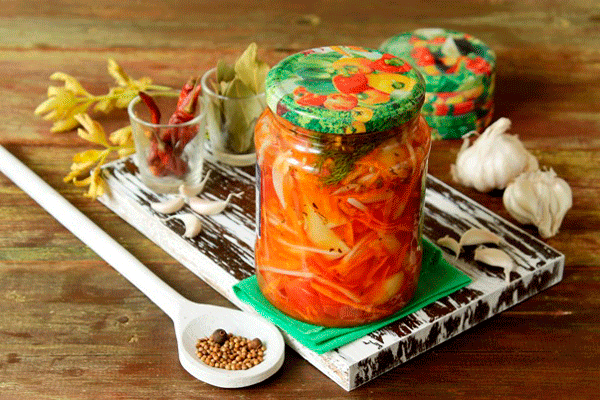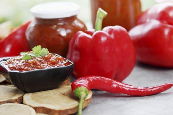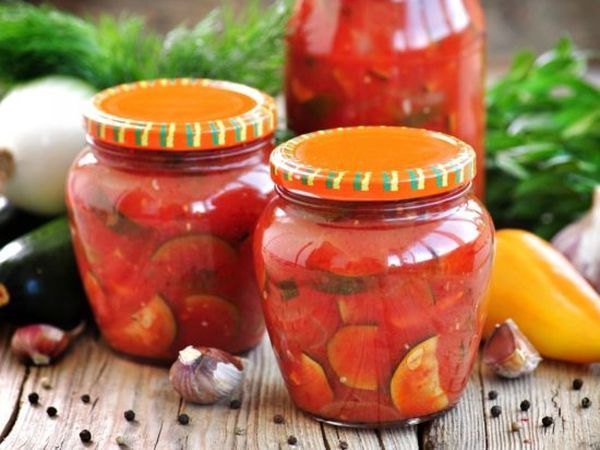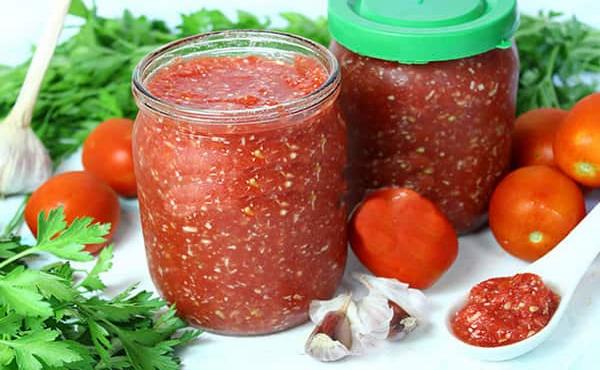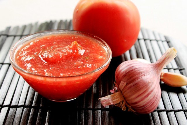 Pievienojot ēdienam citus dārzeņus, pikantā uzkoda iegūst patīkamu garšu. Tomēr galvenās sastāvdaļas joprojām ir ķiploki un tomāti.