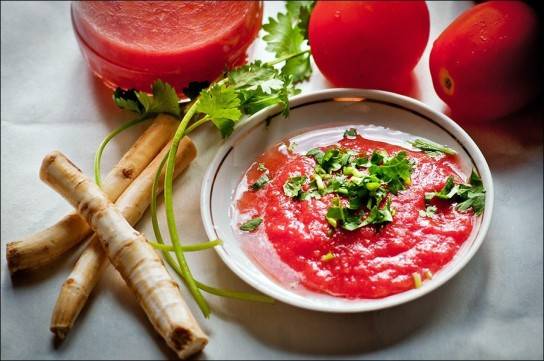 - ķiploki ar mārrutkiem proporcijā 1:3 ar tomātiem.