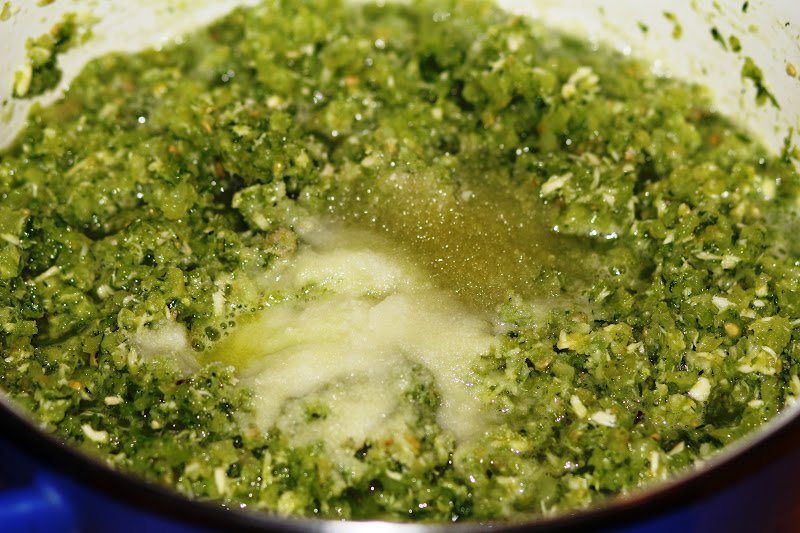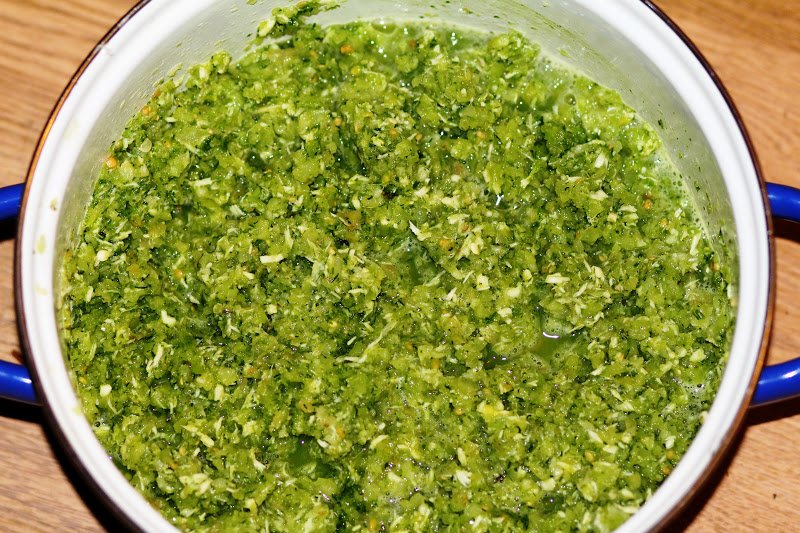 Visas sastāvdaļas tiek nomizotas un sasmalcinātas, izmantojot jebkuru metodi. Sajauc, pievieno garšvielas un iepilda burkā.