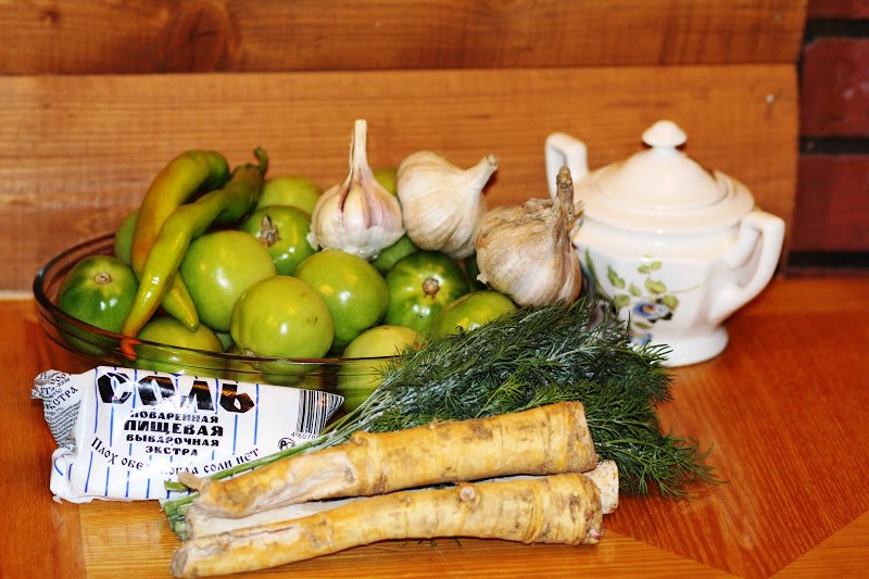 Ja pēc novākšanas uz ķekariem ir palikuši nenogatavināti tomāti, tos arī var izmantot. Lai apstrādātu 2 kilogramus, jums būs nepieciešams: