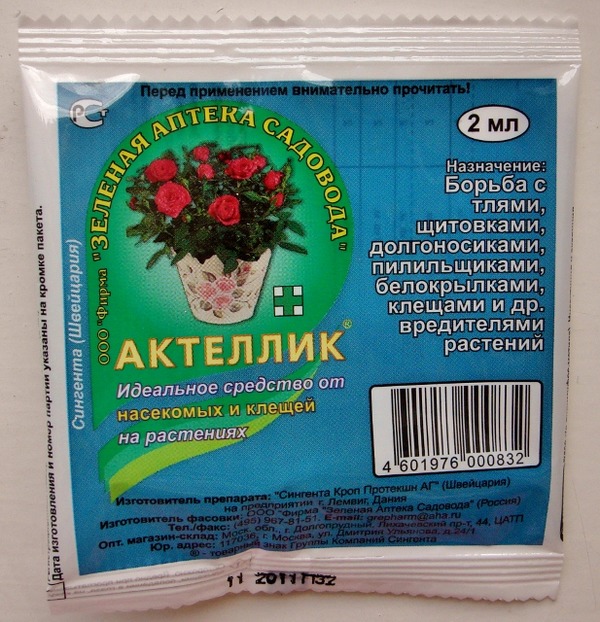 - Actellic ir ļoti efektīvs līdzeklis, taču ar to jārīkojas ļoti uzmanīgi, izmantojot cimdus un marles saiti. Tas ir pieejams nelielās ampulās, kuru saturu pievieno ūdenim un pēc tam uzklāj kā šķīdumu uz skartajām augu daļām.