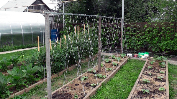 - Režģis. Šī metode ir visizplatītākā. Režģis ir arī visiespaidīgākā nostiprināšanas metode. Ir vērts atzīmēt, ka šāds režģis var kļūt par dekoratīvu papildinājumu dārzam vai dārzeņu dobei. Režģis ir koka stabs, pie kura pienaglots smalks tīkls. Gar šo tīklu jānovieto viens kāts. Visi pārējie dzinumi tiek noņemti, tādējādi izveidojot vienu kātu. Augšējie dzinumi tiek atstāti savā vietā. Tie ir pietiekami, lai augu stingri nostiprinātu pie restes.