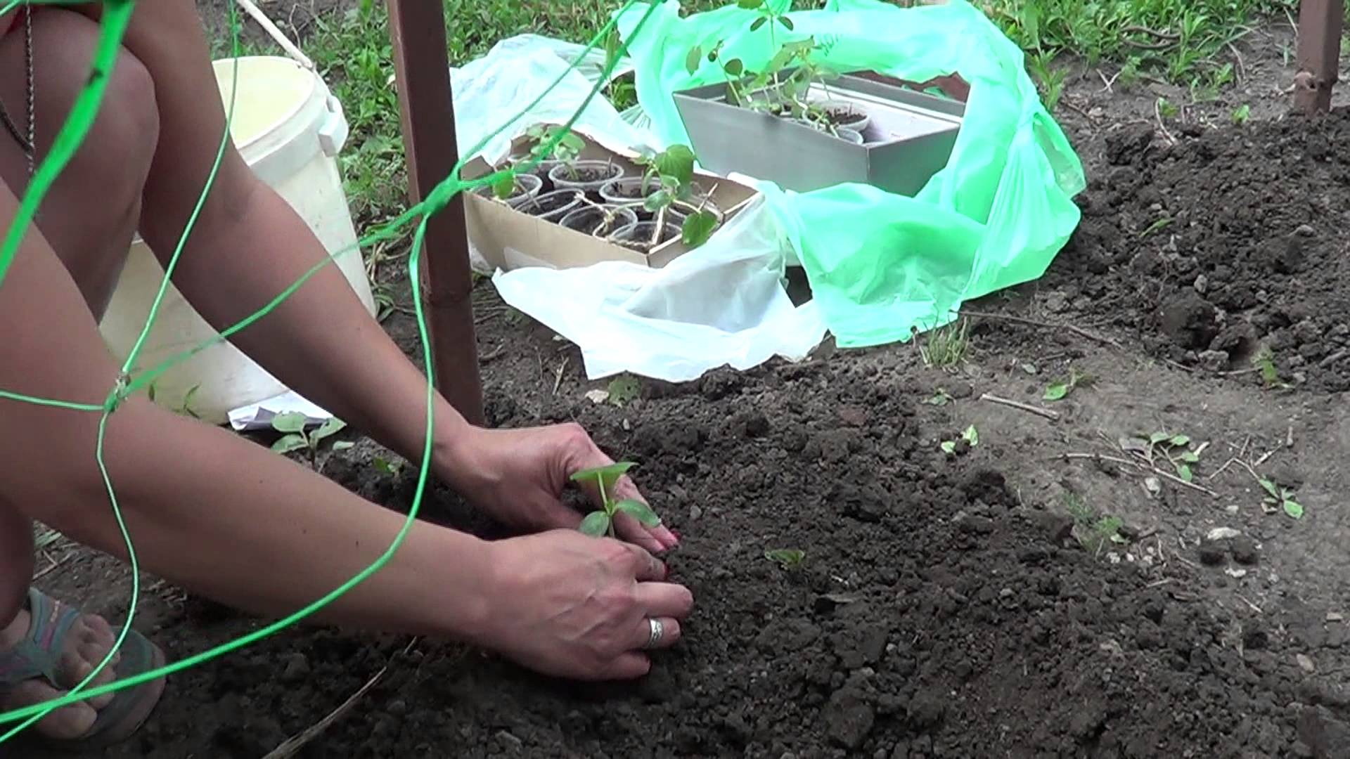 Šajā video lauksaimnieki dalās pieredzē, stādot gurķu sēklas un stādus zemē.