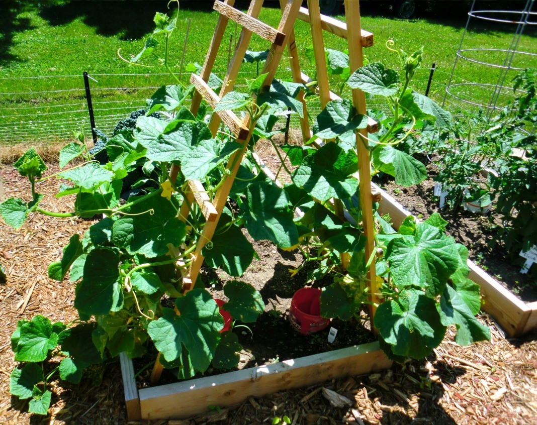 Alternatīvi, dārzeņu kultūru kāpšanai varat izmantot īpašu tīklu, kas, līdzīgi kā režģis, ir izstiepts starp diviem atbalsta stabiem. Ir arī ērti izmantot divus sieta gabalus, kas viens otram piestiprināti leņķī, veidojot teltsveida struktūru. Nogatavojušies augļi graciozi karājas no šīs struktūras, ievērojami atvieglojot ražas novākšanu.