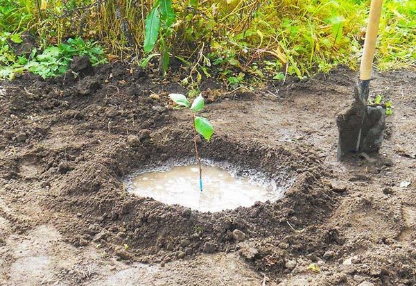 - Mēslošanas līdzekļus (humusu, superfosfātu, pelnus) ielej bedrē, pēc tam ielej spaini ūdens.