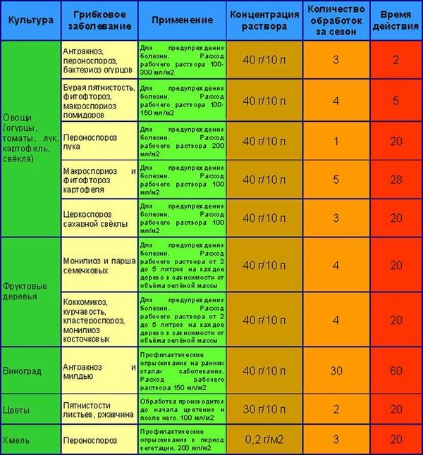 - Šis līdzeklis aizsargā dārzeņu un sakņaugu kultūras no pūkainās miltrasas, antraknozes, bakteriālās vītes, lakstu puves, makrosporiozes, cerkosporas lapu plankumainības un brūnplankumainības. Šķīdumu sagatavo ar ātrumu 40 g uz 10 litriem ūdens. Iedarbības laiks gurķiem un tomātiem ir 2–5 dienas, bet citām kultūrām – 20–28 dienas.