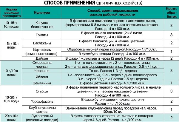 Sagatavotais šķīdums (2 litri ūdens un 2 grami produkta) ir pietiekams 40 m² dārza vai siltumnīcas apstrādei. Tomātu, baklažānu un papriku pirmo apsmidzināšanu veic pumpuru veidošanās stadijā, kam seko atkārtota apsmidzināšana pirmā, otrā un trešā ķekara ziedēšanas laikā.