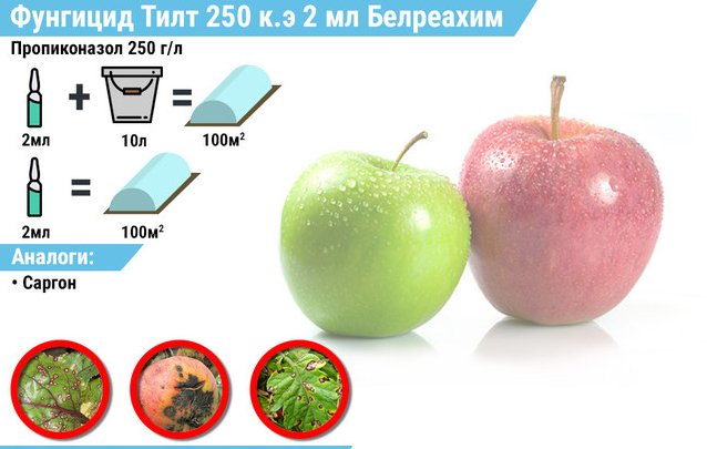 Pamatojoties uz Tilt lietošanas noteikumiem, apstrāde tiek veikta noteiktā laikā un ar precīzu preparāta (darba šķīduma) daudzumu dažādām kultūrām: