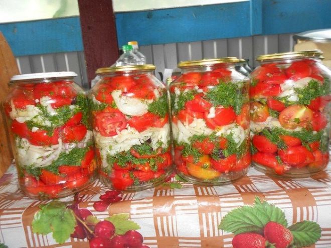 - Burkas pilda kārtu pa kārtai, pārmaiņus liekot tomātus un sīpolus.
