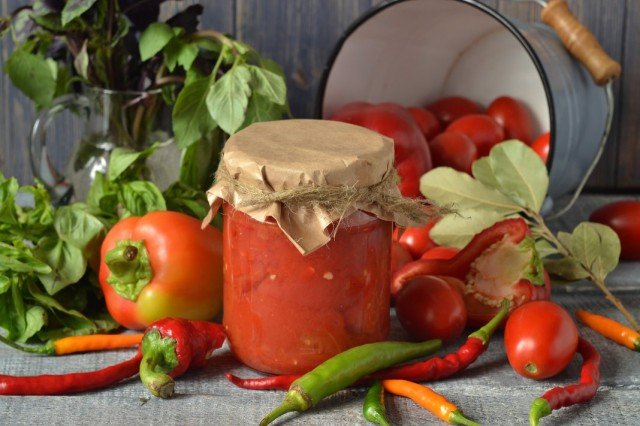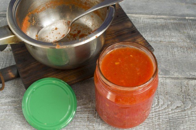 - Garšaugus un ķiplokus sasmalcina un pēc tam sajauc ar tomātu mīkstumu.