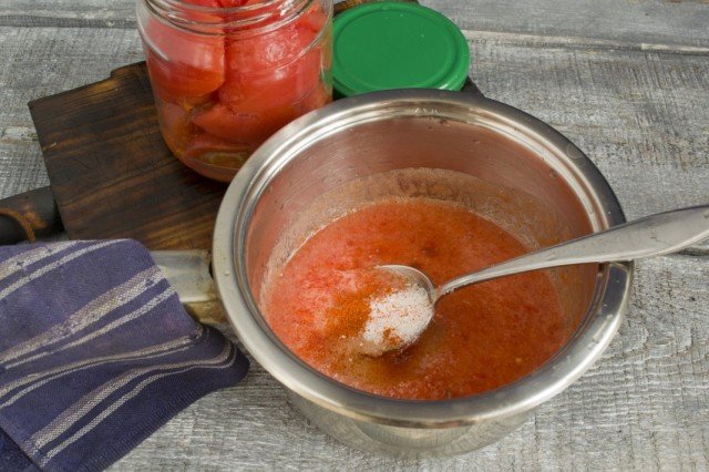 - Ielejiet to tomātu burkās, nedaudz piespiežot, lai augļi būtu pilnībā iegremdēti.