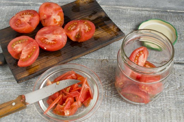 - Nomizotus tomātus ievietojiet sterilizētās burkās.