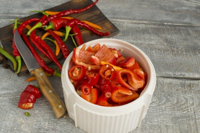 - No paprikas izņem sēklas un pēc tam sasmalcina kopā ar ķiploku.