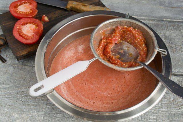- Sasmalciniet tomātus un izberzējiet tos caur sietu.
