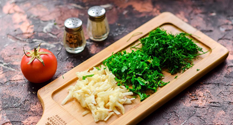 - zaļumi tiek sasmalcināti, ķiploki tiek saspiesti;