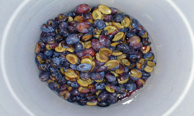 - Pārlejiet biezenī saberztās plūmes ar attīrītu ūdeni, saglabājot proporcijas (1:1).