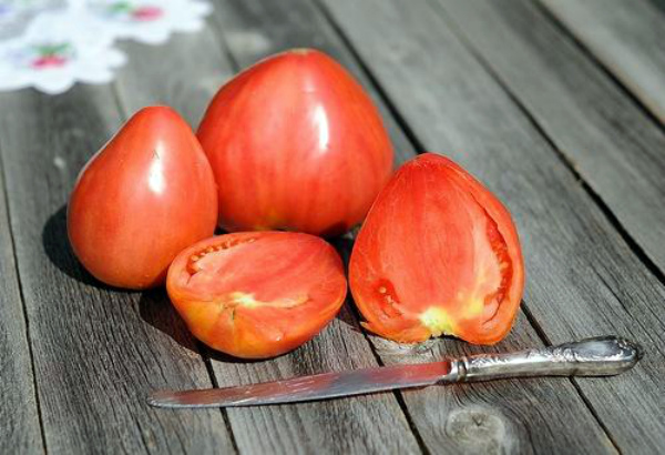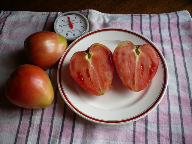 Mūsu tomātu šķirne "Batyanya" tiek uzskatīta par ļoti ražīgu, jo no viena krūma var dot vairāk nekā 6 kg lielu, gardu augļu. Šīs šķirnes vidējais svars ir 250–350 g, un siltumnīcā var audzēt pat puskilogramu augļus. Krāsa ir rozīgi tumši sarkana, miziņa ir stingra un spīdīga, forma ir liela sirds ar izteiktu galu. Augļi ir sulīgi, ar saldu mīkstumu un nelielu sēklu skaitu, un tiem ir patīkama, nedaudz salda garša.