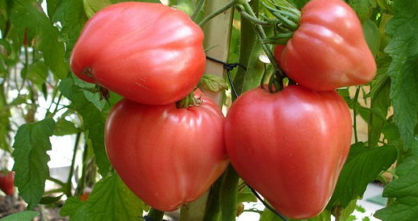 - Spilgts lielaugļu tomātu piemērs ir šķirne 'Pink Honey'. Tās zemie krūmi dod nedaudz saplacinātus augļus, kuru svars sasniedz 700 g un kas ir izturīgi pret plaisāšanu. Šie tomāti ir piemēroti salātiem un pārstrādei sulā vai tomātu pastā.