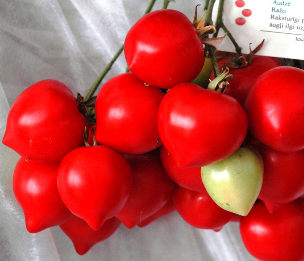 - Lāsteka (dzeltena, rozā, melna). Vēl viens hibrīds, ideāli piemērots marinēšanai un konservēšanai. Augstie krūmi (virs 1 m) veido lielus, smagnējus augļu ķekarus. Tomāti ir mazi (80–100 g), iegareni, ar smailu galu un patīkami saldu garšu. Tie labi uzglabājas un transportējas.