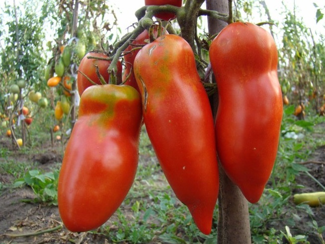 'Scarlet Candles'. Nenoteikta šķirne, kas izceļas ar izcilu ražu, pateicoties 100% augļu aizmetošanai. Krūmi ir spēcīgi (1,5 m), blīvi lapoti, un augļu ķekari ir sakārtoti līmeņos. Augļi ir iegareni un cilindriski ar smailu galu, rozīgā krāsā, ar gaļīgu un diezgan saldu mīkstumu. Piemēroti konservēšanai, sālīšanai un svaigiem salātiem.