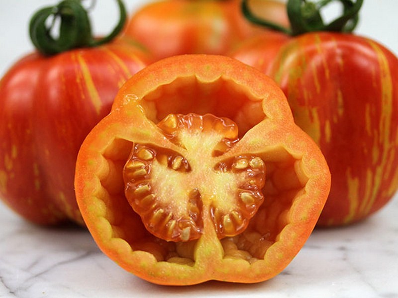 - Svītrainais pildījums. Augsti ražīgs vācu hibrīds ar neparastiem, dekoratīviem augļiem. Tomāti ir kubveida un svītraini, dzelteni un sarkani. Sēklu ir maz, tās ir saspiestas un viegli izņemamas, radot dobumu pildījumam.