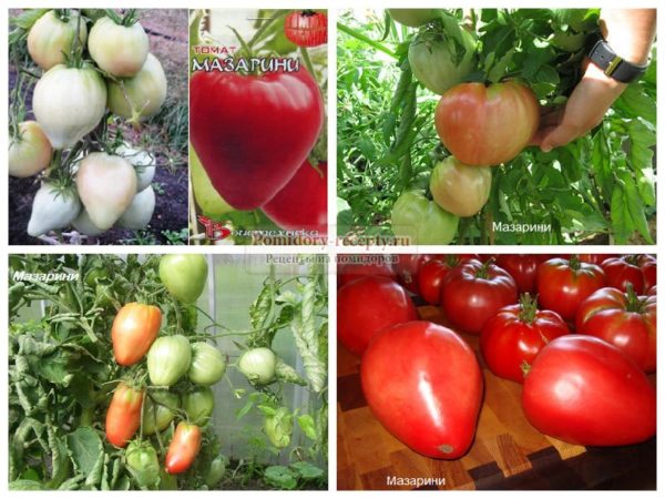 Mazarini hibrīdaugi ir līdz 2 metrus augsti nenoteikta auguma krūmi ar daudzām lapām. Ziedu ķekars dod 5–6 augļus. Pirmā tomātu raža tiek novākta jūnijā, pēdējā – līdz ar salnu iestāšanos.