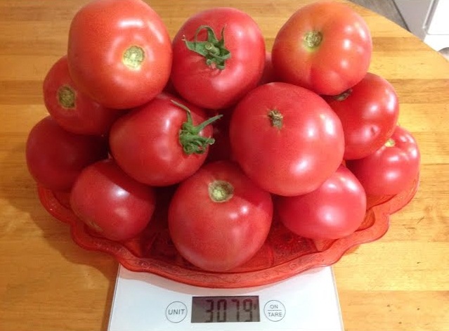- Tie ir ļoti lieli tomāti. Aprakstā teikts, ka to vidējais svars ir 500–700 grami, bet daži ir lielāki, sverot gandrīz kilogramu.