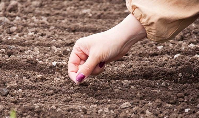 - Pēc tam ar nazi izveidojiet vagas, kurās ievietojiet sēklas. Tās virspusē jāpārklāj ar augsni.