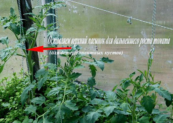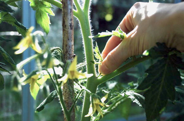 Noteikumi krūma veidošanai siltumnīcā nedaudz atšķiras no noteikumiem, ko izmanto atklātā zemē. Šis process jāsāk, kad krūms izaudzē savu pirmo ziedu ķekaru. Augstām tomātu šķirnēm šis ķekars parādās virs 10. vai 11. lapas, un pēc tam ķekari parādās pēc trim lapām. Sānu dzinumus parasti var atrast zem ziedu ķekara. Lai pareizi noņemtu sānu dzinumus no siltumnīcas, kas izgatavota no polikarbonāta vai cita materiāla, stādījumi jāpārbauda reizi nedēļā un jānoņem dzinumi. Kā daudzi dārznieki ir pierādījuši, nenoteiktu šķirņu pirmo sānu dzinumu siltumnīcā var izkniebt, atstājot ķekaru ar ziediem. Lai to izdarītu, atstājiet pāris lapas sānu dzinuma augšanas virzienā un pēc tam nolauziet dzinumu virs tām.