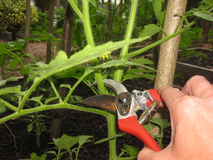 Lai mazinātu stresu, kas neizbēgami rodas, noņemot lielu skaitu lapu un dzinumu, sānu dzinumus jānoņem bieži, vismaz reizi nedēļā. Laikapstākļiem jābūt sausiem un saulainiem. Vēlams dienas pirmajā pusē, lai radītās brūces varētu pilnībā nožūt, novēršot jebkādu infekciju. Ja sānu dzinums tiek pilnībā noņemts, galu galā tajā pašā vietā izaugs jauns. Tāpēc tas jānokniebj 1–1,5 cm augstumā no lapas padusēm, atstājot celmu.