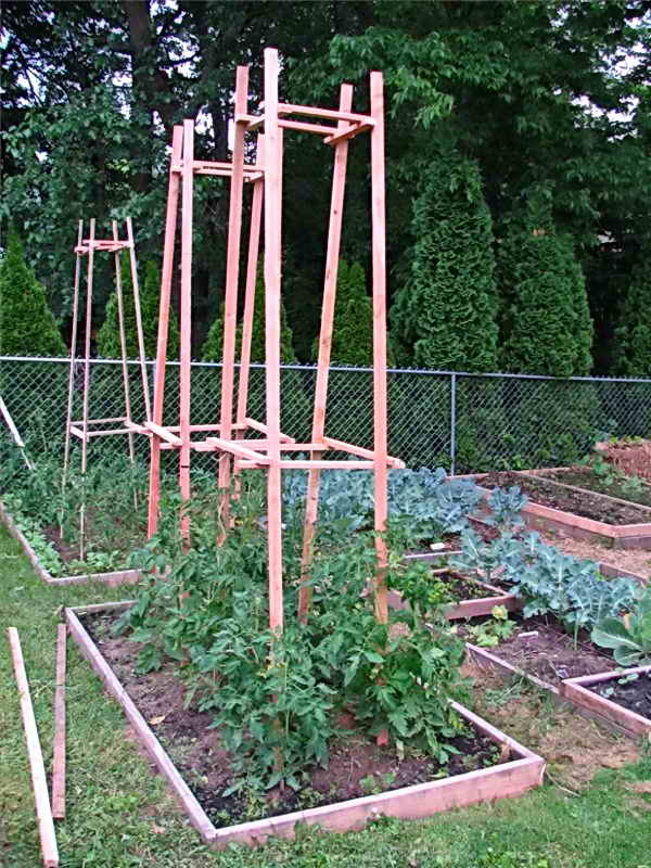 Režģa izgatavošana nav sarežģīta. Katrai dobei būs nepieciešami divi mietiņi. Piestipriniet tos pie dobju malām un starp tiem izstiepiet stiepli. Pie stieples piestipriniet auklas, pa vienai katram tomātu stādam. Apsieniet katru auklu ap augu. Kad augs sāk augt, aptiniet to ap auklu.