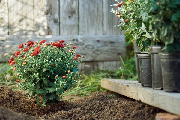 Stādīšanas bedres apakšā ir rupjas upes smilts slānis, kas kalpo kā drenāža. Smiltis pārkaisa ar sasmalcinātām olu čaumalām. Tikai retais zina, ka olu čaumalas ne tikai absorbē mitrumu, bet arī tiek uzskatītas par labu mēslojumu. Pēc tam, pievienojot minerālmēslu vai organisko mēslojumu, izveido augsnes uzbērumu. Krizantēmas stāds sekli iesakņojas bedres centrā izveidotajā uzbērumā. Augstākām šķirnēm tiek uzstādīti balsti.