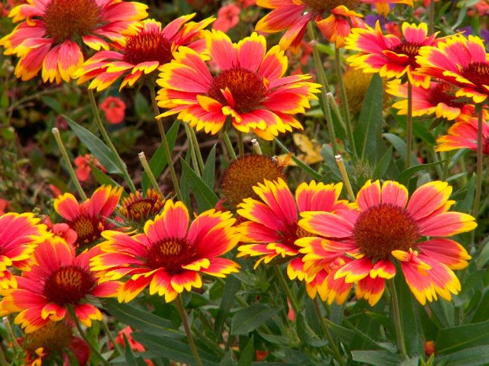 Gaillardijas ziedkopas ir sarkanīgas, rozā, dzeltenīgas un oranžas.