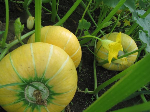 Lapas ir lielas, ar virspusē redzamu rakstu. Ziedi ir dzelteni vai oranži un brīnišķīgi smaržīgi. Viens krūms parasti dod 10 līdz 15 mazus ķirbjus.