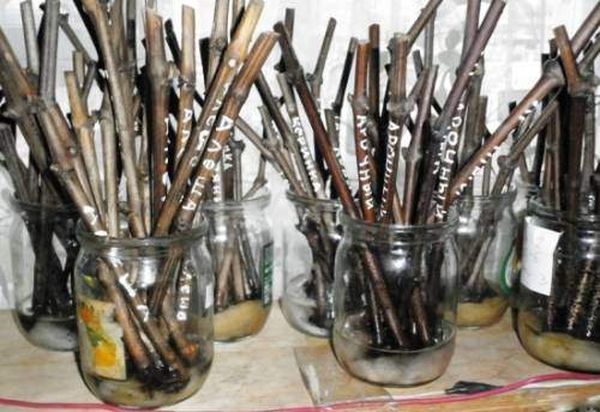 Uzmanīgi savāciet nākamos stādus saišķos un noteikti marķējiet katru saišķi ar šķirnes nosaukumu, lai izvairītos no neskaidrībām, pārstādot spraudeņus. Pēc tam ievietojiet tos plastmasas maisiņā un uzglabājiet speciāli sagatavotā uzglabāšanas vietā. Visas šīs darbības jāveic ne vēlāk kā ziemas sākumā, lai novērstu materiāla bojāšanos.