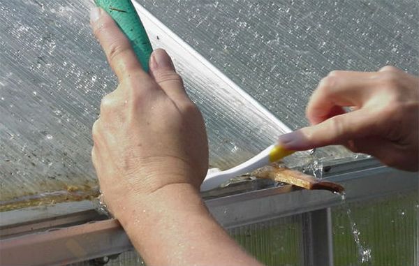 Ja nevēlaties izmantot ķīmiskas vielas, varat samalt parastas veļas ziepes un pievienot tās ūdens traukam. Iegūto šķīdumu izmantojiet siltumnīcas iekšpusē esošo sienu mazgāšanai. Tomēr polikarbonāta siltumnīcas dezinfekcija parasti tiek veikta rudenī ar ķīmiskām vielām vai bioloģiskiem produktiem. Tomēr pēdējais ir vēlams pavasarī.
