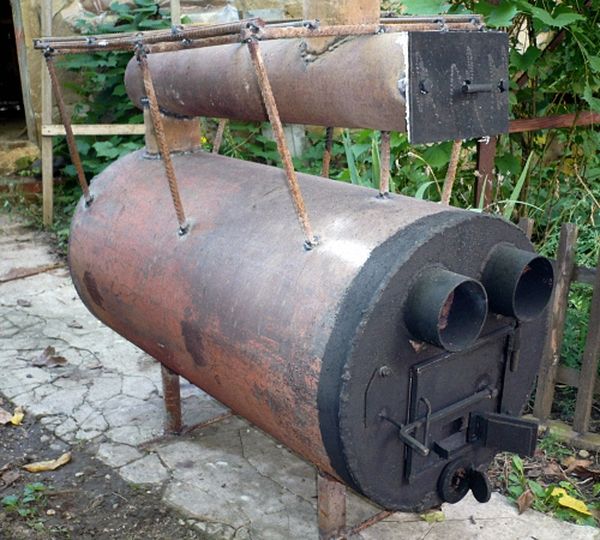 Piemēram, lai izgatavotu vienu no cilindra, nogrieziet augšējo daļu. Augšpusē izveidojiet caurumu skursteņa dūmvadam un apakšā perforētai caurulei. No cilindra augšdaļas izveidojiet vāku.