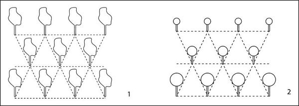 Ja izvēlētie augi ir potēti uz augstiem potcelmiem un tiek stādīti rindās, starp rindām jāievēro vismaz 5 metru attālums. Attālumam starp kokiem katrā rindā jābūt aptuveni vienādam. Ja šis attālums netiks ievērots, augi izstiepsies (saules gaismas trūkuma dēļ), ievērojami samazinot produktivitāti un ražu.