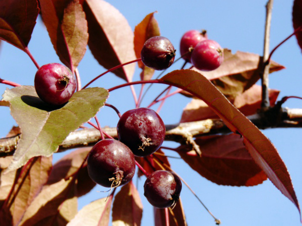 Koka augļi ir ļoti mazi, parasti apaļi vai retāk nedaudz iegareni. Tie ir sarkanā vai violetā krāsā. Āboliem ir bieza miziņa ar vieglu pārklājumu. Tiem ir skāba garša, tāpēc tos reti ēd. Augļi ir stingri piestiprināti pie zariem un saglabā savu formu pat salnu sākumā.