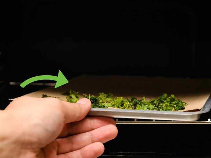 Sagatavotās pētersīļus lieciet uz cepamās plāts, kas izklāta ar cepampapīru, un ievietojiet cepeškrāsnī. Ieslēdziet cepeškrāsni uz zemāko temperatūru un atstājiet durvis nedaudz pusatvērtas, lai gaiss varētu brīvi cirkulēt.
